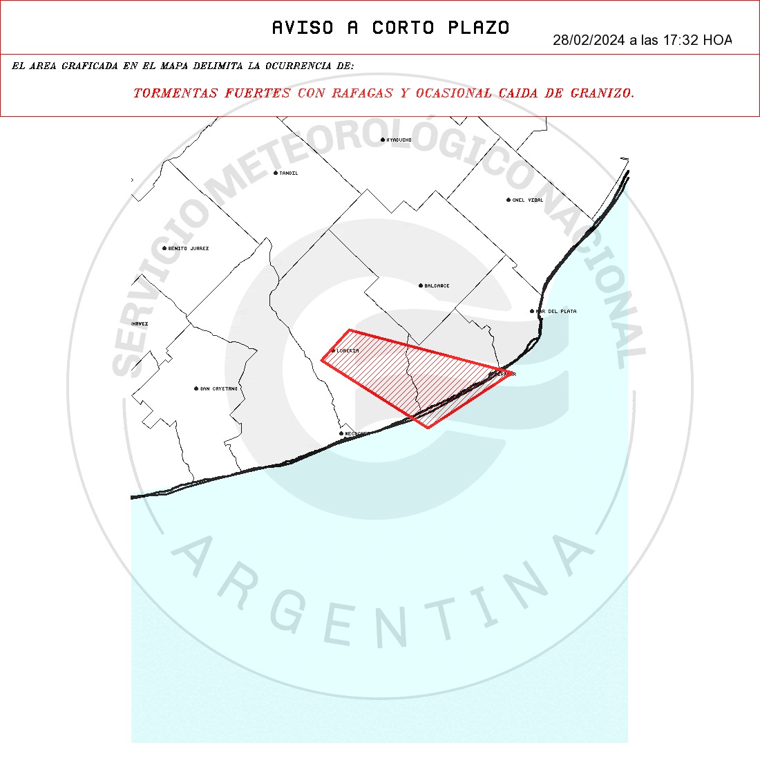 Interes General Aviso meteorológico a muy corto plazo 28 febrero, 202429 febrero, 2024 AVISO METEOROLÓGICO A MUY CORTO PLAZO N 1536 PARA: GRAL ALVARADO – LOBERIA. POR TORMENTAS FUERTES CON RAFAGAS Y OCASIONAL CAIDA DE GRANIZO. VALIDEZ: UNA(1) HORA POSTERIORES A LA EMISIÓN. FUENTE SMN. Notas relacionadas:Aviso meteorológico a muy corto plazoAlerta por tormentaTipo de Alerta: por TormentaAlerta amarillo por tormentas, para el jueves 15 de eneroAlerta meteorológica amarilla para Gral. Alvarado…Descripción alerta amarilla por tormentas para hoy ,…