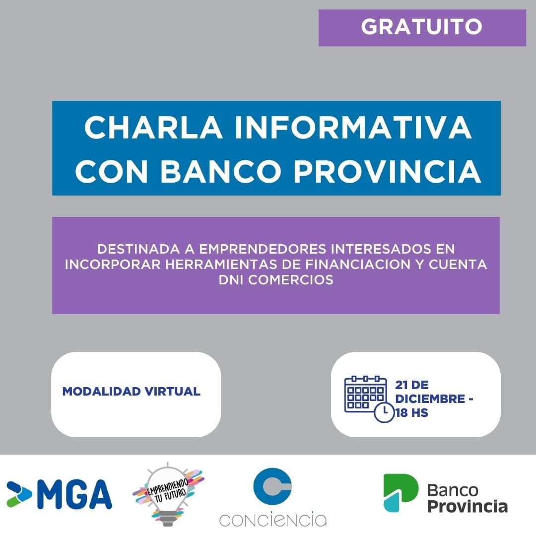 La Dirección de Empleo Municipal te invita a participar de esta charla informativa gratuita brindada por el Equipo Técnico de “Asociación Conciencia”, para conocer posibilidades que ofrece el Banco Provincia para emprendedores: