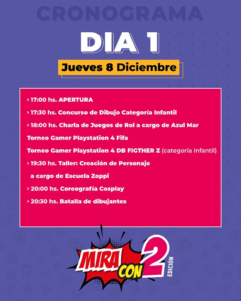 Turismo Comienza la Miracon 2 8 diciembre, 2022 A partir de las 17 hs en el Polideportivo Municipal.📌 Concursos, talleres, dibujantes en vivo, juegos, gaming, buffet, stands temáticos, cosplay. Notas relacionadas:Los Concursos de la MiraCon 2MiraCon 3° EdiciónExitosa Mira-Con en Miramar¡Se viene la MiraCon 2025!MiraCon 3° Edición¡Vuelve la Miracon!