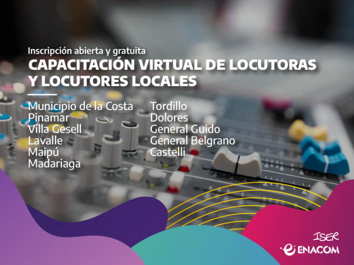 Con el objetivo de sostener a través de políticas federales concretas el trabajo gestionado por el Ente Nacional de Comunicaciones (ENACOM) para amplificar la pluralidad de voces en distintas regiones del país, comenzará a dictarse un curso de capacitación para locutoras y locutores destinado a los y las personas que trabajen en dicho rubro en el Municipio De La Costa, Pinamar, Villa Gesell, Lavalle, Maipú, Madariaga, Tordillo, Dolores, Gral. Guido, Gral. Belgrano y Castelli.