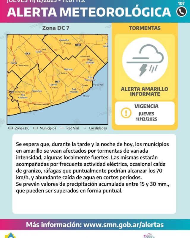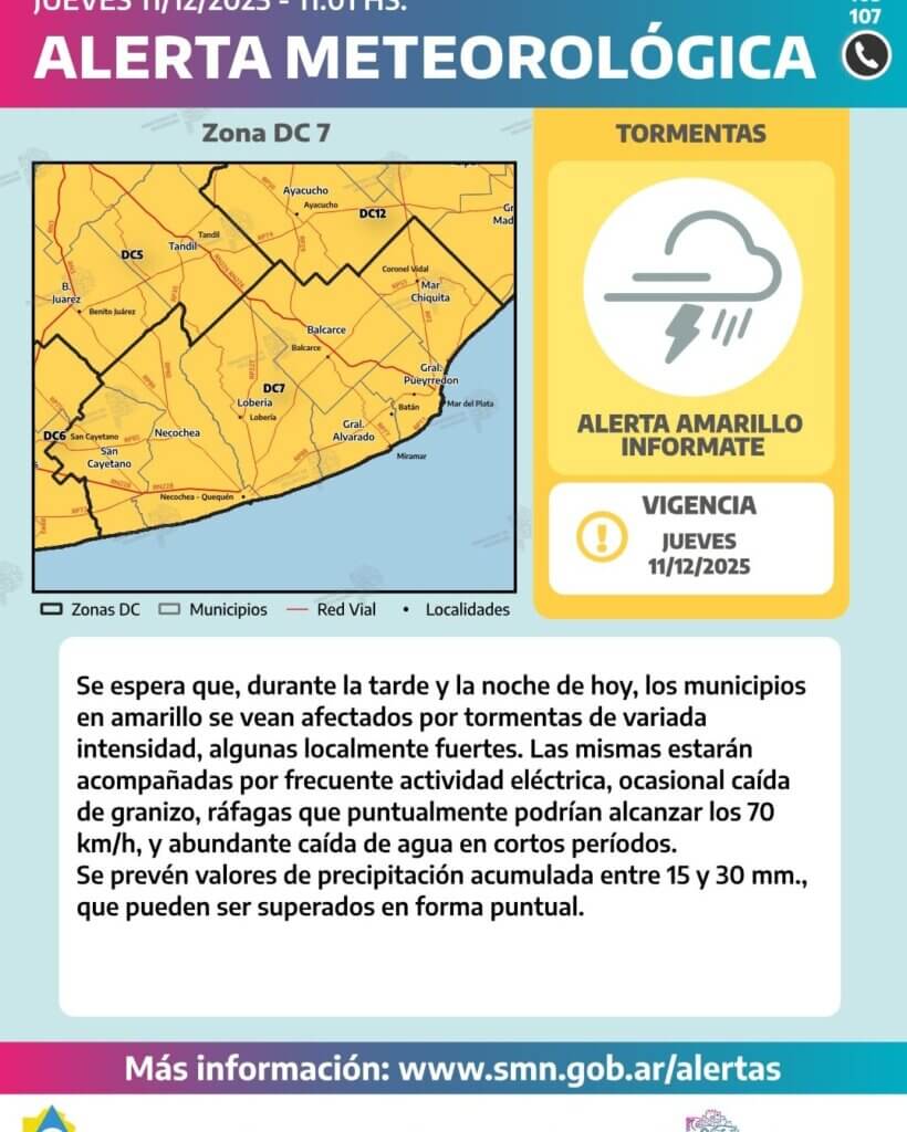 Se espera que con el avance de un débil sistema de baja presión sobre la PBA, los municipios en amarillo sean afectados entre la tarde y la noche de hoy, por lluvias y tormentas de variada intensidad, algunas de las cuales pueden ser localmente fuertes y estar acompañadas por ráfagas que puntualmente podrían alcanzar los 70 km/h, chaparrones intensos de corta duración y ocasional caída de granizo. Los fenómenos mas intensos son mas probables sobre la franja este de la PBA (Zonas DC 7, 9 y 12)