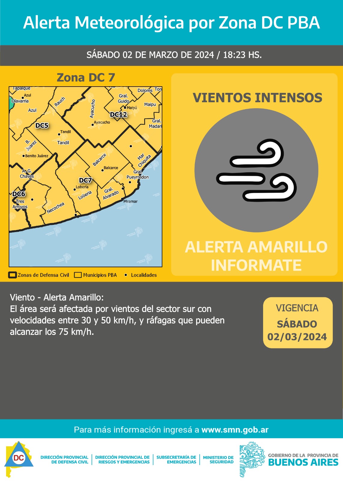Durante la noche se prevé un aumento en la intensidad de los vientos que durará hasta la madrugada del Domingo con velocidades sostenidas entre 30 y 50 km/h con ráfagas que pueden superar los 75 km/h del sudoeste, principalmente sobre municipios costeros.