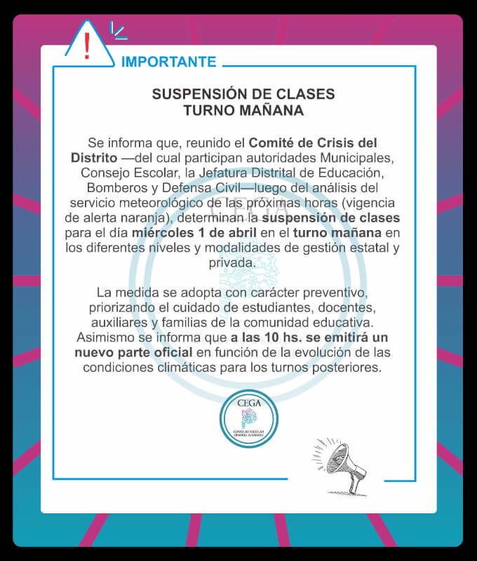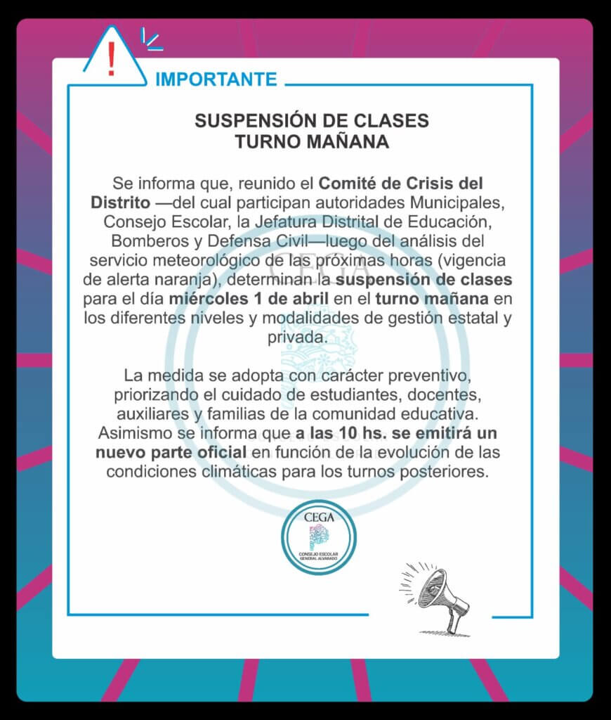 Debido al alerta meteorológico vigente, el Consejo Escolar de General Alvarado ha dispuesto la Suspensión de clases para este miércoles 1º de Abril en el TURNO MAÑANA, en los diferentes niveles y modalidades de gestión estatal y privada para todo el distrito.