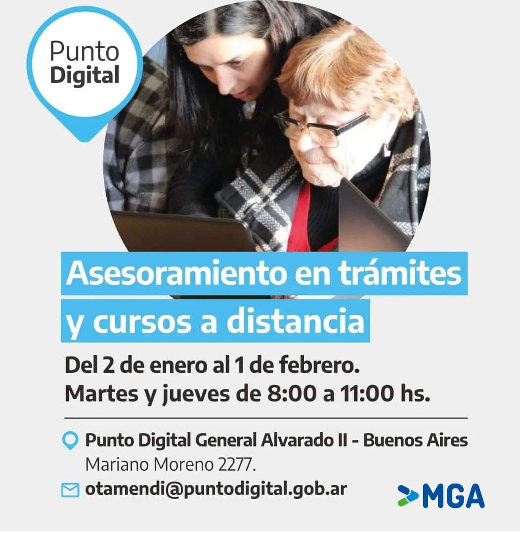 El Punto Digital Otamendi informa que a partir de hoy, 02 de Enero, y hasta el 1º de Febrero, se llevará adelante el Asesoramiento en trámites y cursos a distancia, en el Centro Cultural Municipal “Dima Spósito de Parodi” (Moreno 2277, Cte. Nicanor Otamendi), los días martes y jueves en el horario de 08:00 a 11:00 hs.