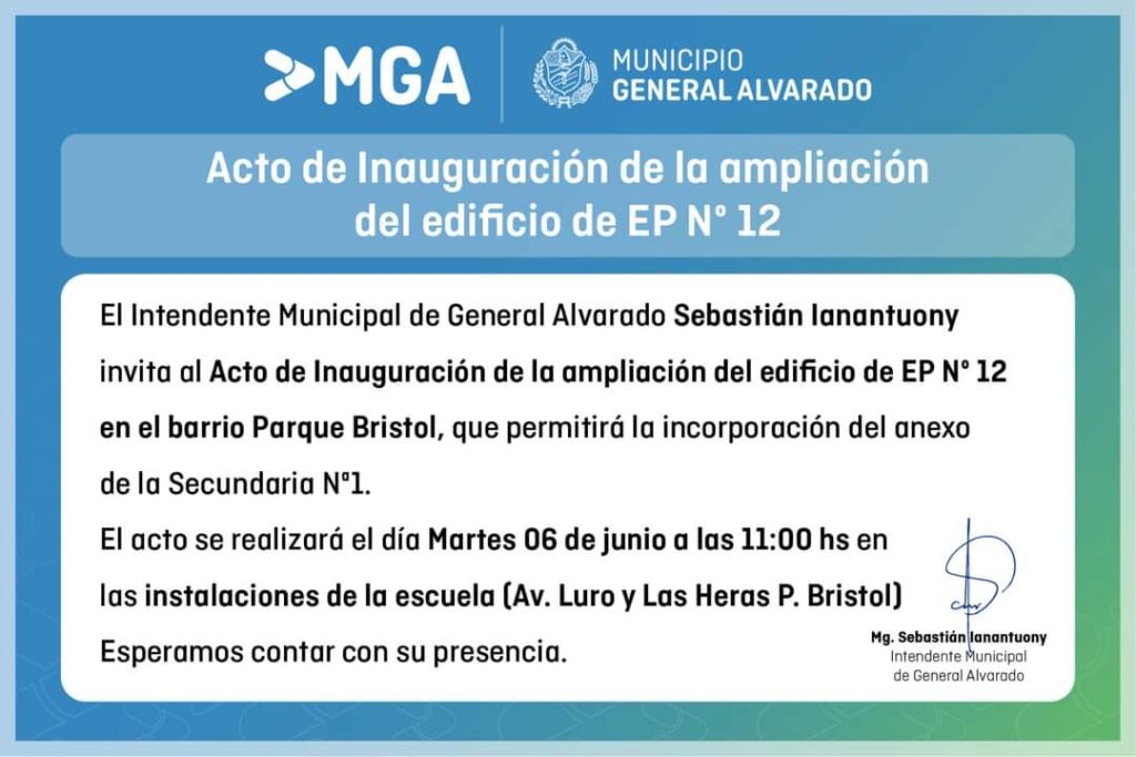 La Jefatura Distrital de Educación de General Alvarado invita a la 12° “ExpoEducativa 2023”, que se llevará adelante los días miércoles 07 y jueves 08 de Junio, de 09:00 a 16:00 hs., en la Av. 26 e/ 21 y 23.