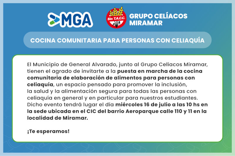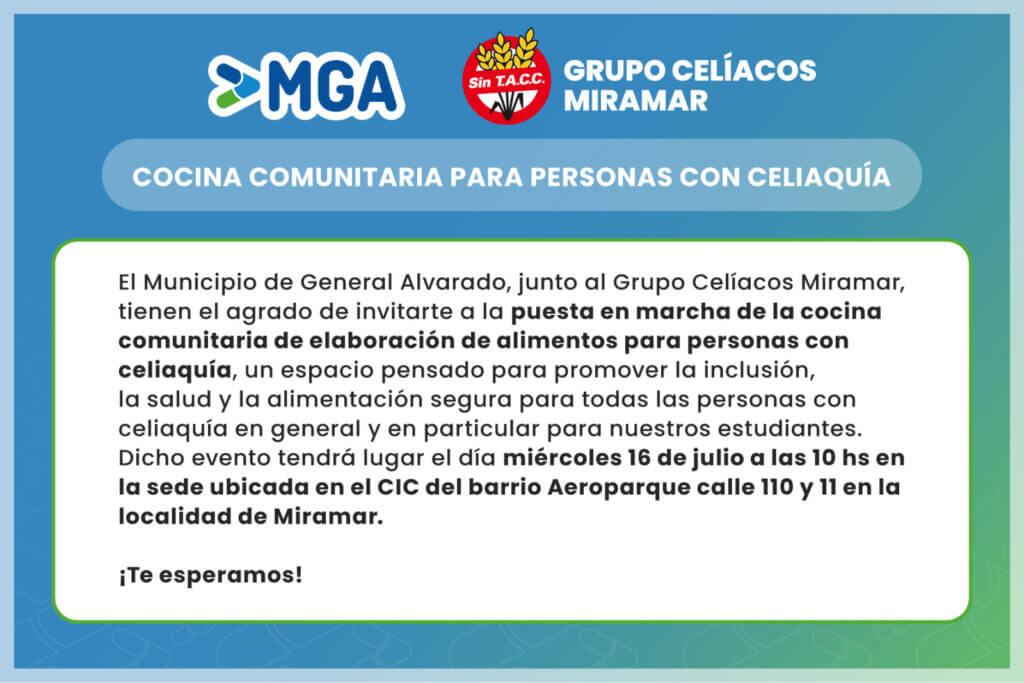 El Municipio de General Alvarado, junto al Grupo Celíacos Miramar, te invita a la puesta en marcha de la cocina comunitaria de elaboración de alimentos para personas con celiaquía.