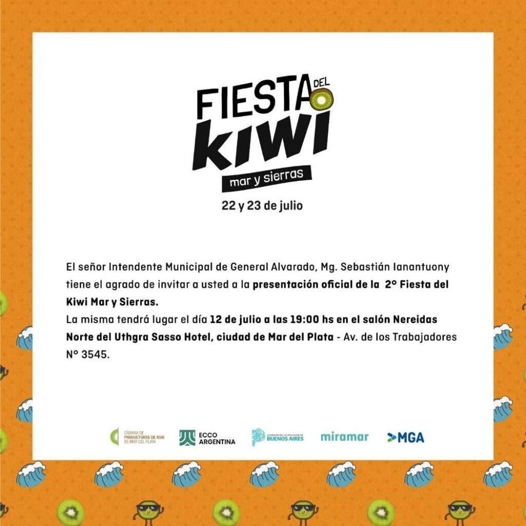 Hoy, miércoles 12 de Julio, a las 19:00 hs., se presentará en el Hotel Sasso UTGHRA (Av. De los Trabajadores 3545, Mar del Plata) la 2° edición de la Fiesta del Kiwi Mar y Sierra 2023, que se llevará adelante en la ciudad de Miramar los días 22 y 23 de Julio.