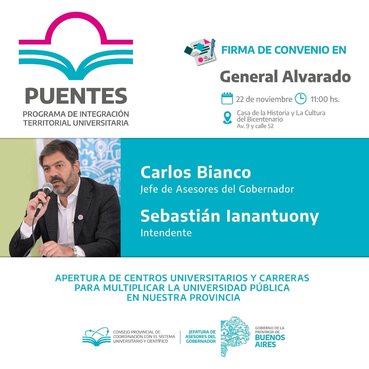 El Intendente Municipal de General Alvarado, Sebastián Ianantuony, recibirá este martes 22 a las 11:00 hs. al Jefe de Asesores del Gobernador Bonaerense, Carlos Bianco, para la firma del convenio para la implementación del Programa de Integración Territorial Universitaria “Puentes” en nuestro distrito.