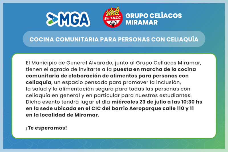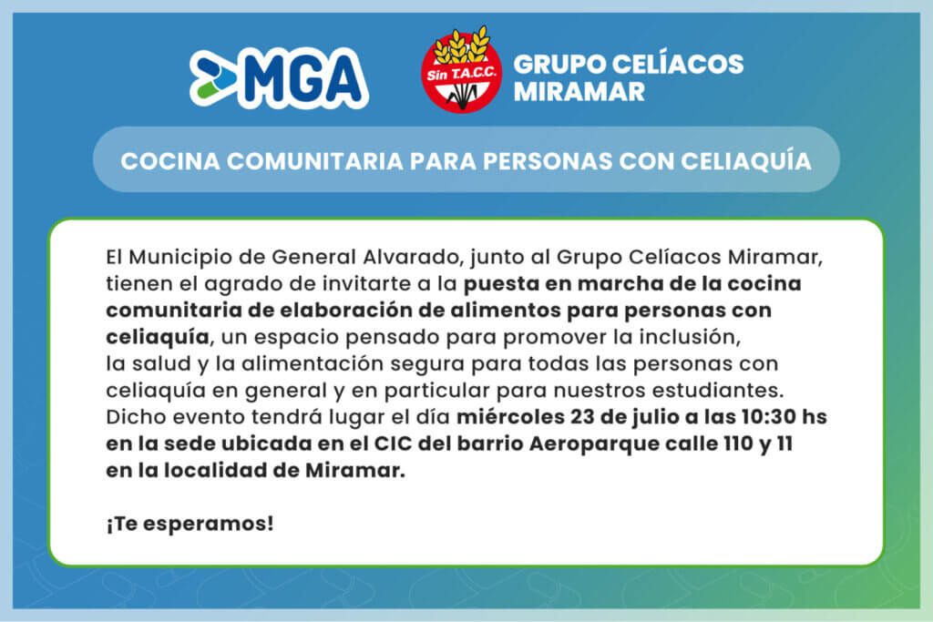 El Municipio de General Alvarado, junto al Grupo Celíacos Miramar, invita a la puesta en marcha de la cocina comunitaria de elaboración de alimentos para personas con celiaquía, que se llevará a cabo este miércoles 23, a las 10:30 hs., en el CIC del Barrio Aeroparque (Calles 110 y 11, Miramar).