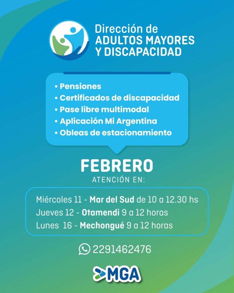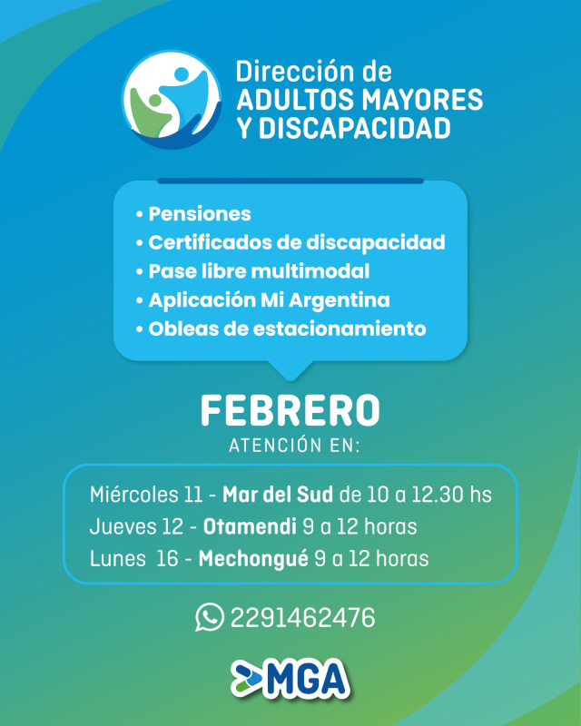 Desde la Dirección de Adultos Mayores y Discapacidad MGA, durante el mes de Febrero se brindará atención en distintas localidades del distrito para asesoramiento y gestión de pensiones, certificados de discapacidad, pase libre multimodal, aplicación “Mi Argentina” y obleas de estacionamiento.