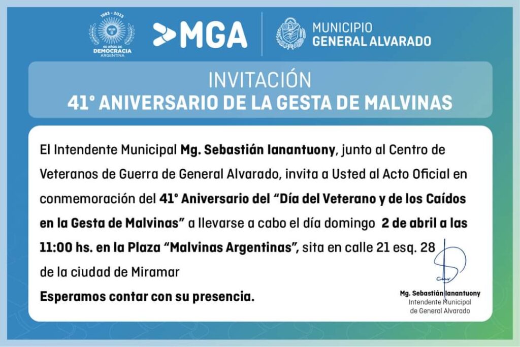 El Municipio de General Alvarado y el Centro de Veterano de Guerra de nuestro distrito, invita este sábado 1° de Abril a las 21:00 hs., a la Vigilia de Malvinas, recordando el 41° de esta gesta.