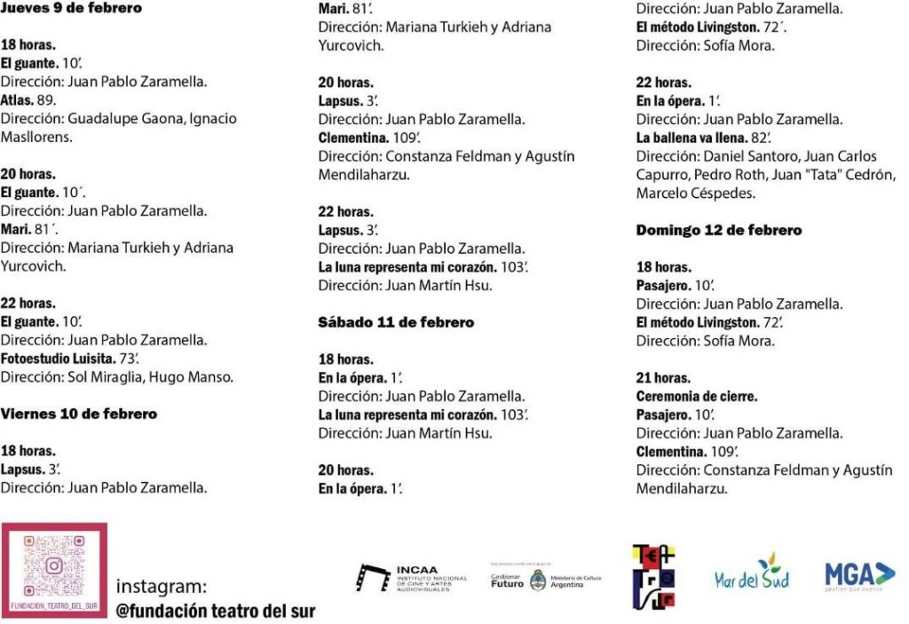 La Fundación Teatro del Sud presenta en su sala (102 y 31, Mar del Sud) la 2da Muestra Nacional de Cine “Mirar en Mar del Sud”, con el apoyo del INCAA, el Ministerio de Cultura de la Nación, y el Municipio de General Alvarado. El evento es de entrada libre y gratuita.