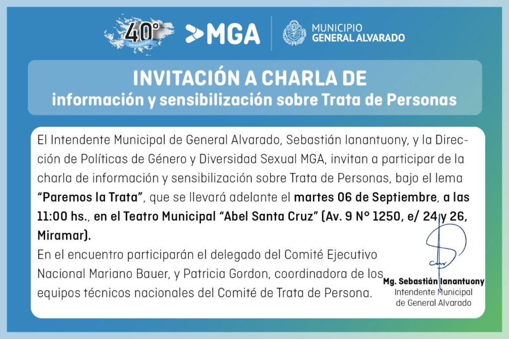 El Intendente Municipal de General Alvarado, Sebastián Ianantuony, invita a participar la charla de información y sensibilización sobre Trata de Personas, bajo el lema “Paremos la Trata”, que se llevará adelante mañana martes 06 de Septiembre, a las 11:00 hs., en el Teatro Municipal “Abel Santa Cruz” (Av. 9 N° 1250, e/ 24 y 26, Miramar).