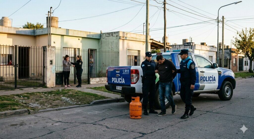 Personal policial, en calle 112 al 1000, aprehendió a un masculino mayor que momentos antes amenazó de muerte a su pareja utilizando una garrafa de gas envasado (foto ilustrativa generada con IA)