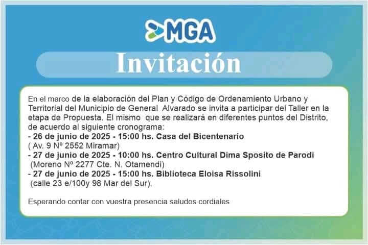 En el marco del Plan y Código de Ordenamiento Urbano y Territorial de General Alvarado, se realizarán talleres abiertos a la comunidad en distintos puntos del distrito.
