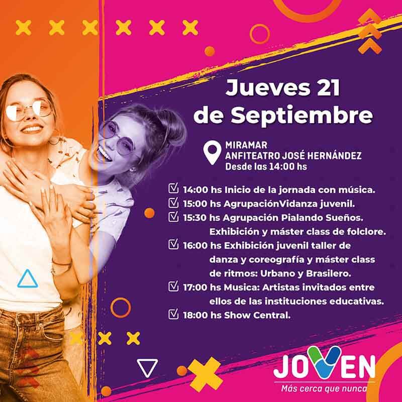 Cultura Semana de la Juventud 21 septiembre, 202321 septiembre, 2023 Miramar, Anfiteatro José Hernández desde las 14:00 hs. Notas relacionadas:“Semana de la Juventud 2022”Inauguración Temporada estival 2023-2024Estelares en Miramar!“Domingo bajo las Estrellas”: Este domingo 29, Folclore!"Inspiración Rosarina"Miramar: Alta ocupación turística