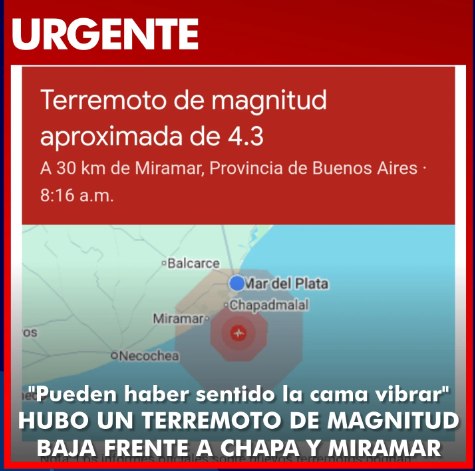 El evento ocurrió a las 8:16 de la mañana y, según el sistema de alertas sísmicas, tuvo una magnitud aproximada de 4.3. El epicentro se ubicó en el mar, a unos 30 kilómetros de Miramar, frente a la costa sur marplatense, a la altura de Chapadmalal.