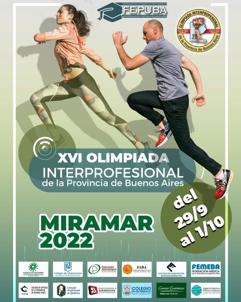 Deportes «XVI Olimpiadas Interprofesionales de la Provincia de Buenos Aires» 30 septiembre, 2022 Representantes de los colegios profesionales, cuyos integrantes competirán en diversas disciplinas deportivas y recreativas en nuestra ciudad durante los días 29/09 al 01/10. Municipalidad de General Alvarado Notas relacionadas:Olimpiadas Judiciales en MiramarExitosa "1° Fiesta de la Familia y el Mar "Gacetilla de Prensa Municipal 28/9/22Gacetilla de Prensa Municipal 30/9/22Gacetilla de Prensa Municipal 29/9/22Dos minibuses para escuelas agrarias